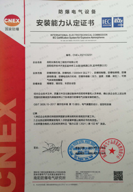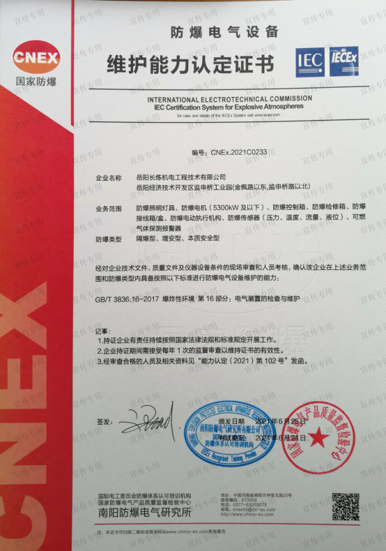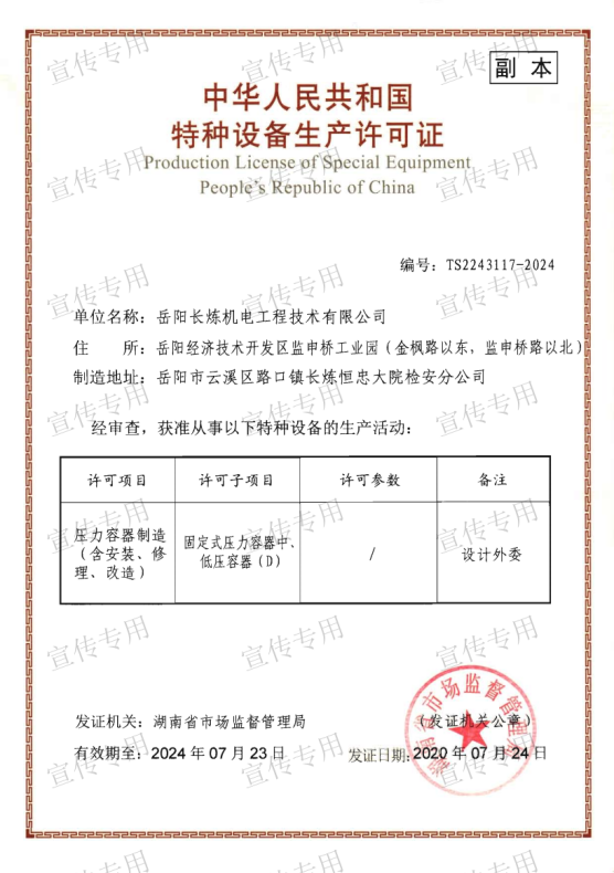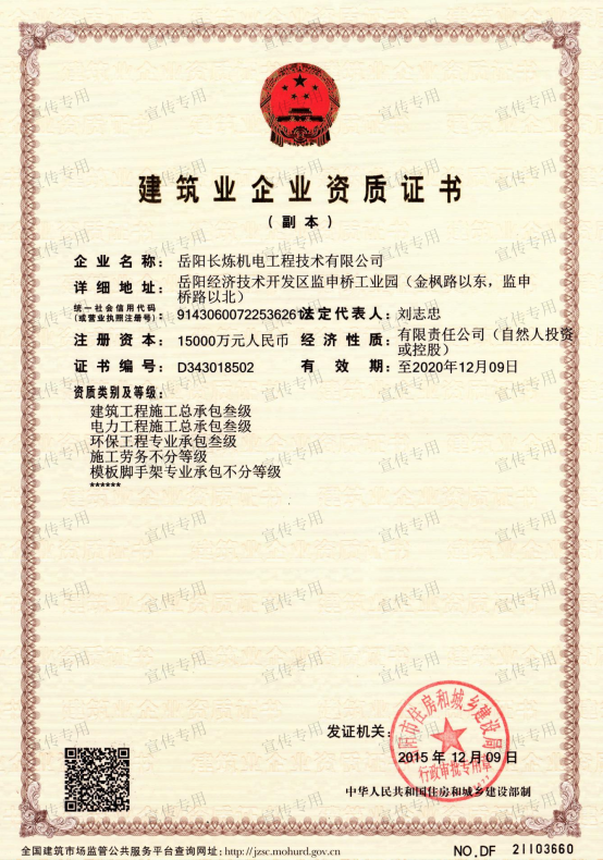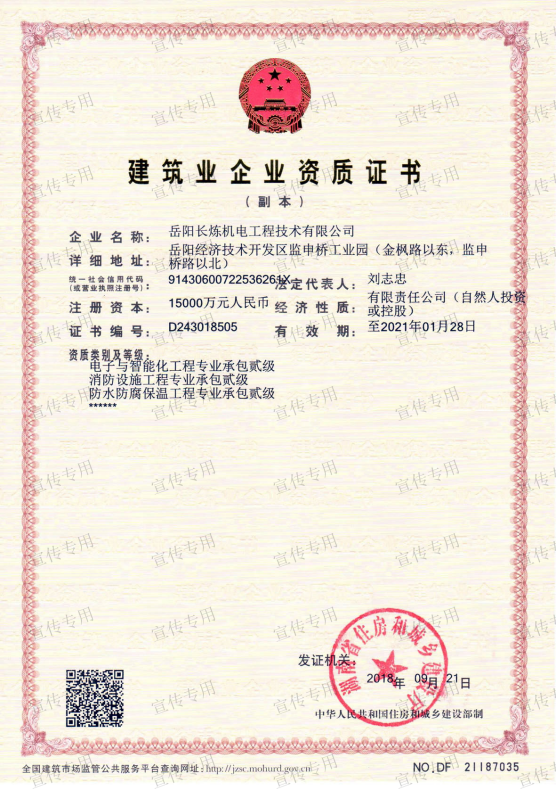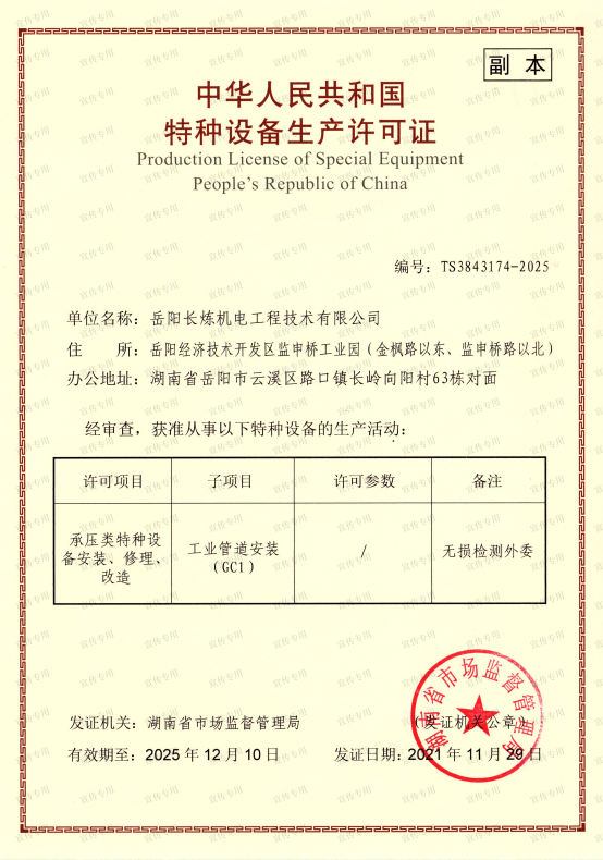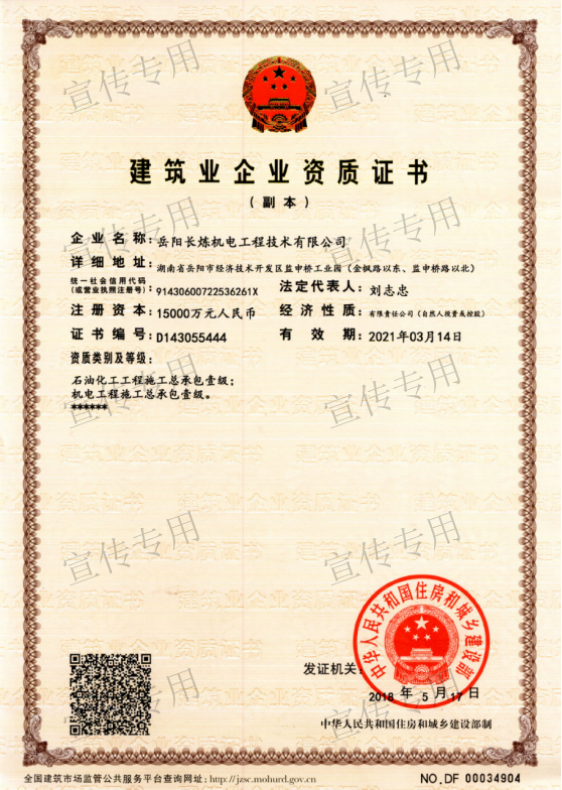 公司擁有石油化工工程施工總承包壹級資質(zhì)、機電工程施工總承包壹級資質(zhì)、檢維修能力評定(9大類38項)、建筑工程施工總承包叁級資質(zhì)、電力工程施工總承包叁級資質(zhì)、環(huán)保工程專業(yè)承包叁級資質(zhì)、消防設(shè)施工程專業(yè)承包貳級資質(zhì)、防水防腐保溫工程專業(yè)承包貳級資質(zhì)、電子與智能化工程專業(yè)承包貳級資質(zhì)、施工勞務(wù)不分等級資質(zhì)、兩化(工業(yè)化、信息化)融合管理體系認(rèn)證、A級工業(yè)設(shè)備高壓水清洗資質(zhì)、特種設(shè)備生產(chǎn)許可證(中、低壓壓力容器制造(含安裝、修理、改造)(D))、特種設(shè)備安裝改造維修許可證(壓力管道)GC1級、特種設(shè)備安裝改造維修許可證(鍋爐)1級、特種設(shè)備安裝改造維修許可證(起重機械)B級;特種設(shè)備檢驗檢測機構(gòu)核準(zhǔn)證(安全閥定期校驗)檢驗項目FD1、FD2、承裝(修、試)電力設(shè)施許可證(承裝類二級、承修類二級、承試類三級)、防爆電氣設(shè)備安裝、修理資格證書、計量標(biāo)準(zhǔn)考核證書的二氧化硫氣體檢測儀檢定裝置、硫化氫氣體檢測儀檢定裝置、熱電偶標(biāo)準(zhǔn)裝置、可燃氣體檢測報警器檢定裝置、精密壓力表標(biāo)準(zhǔn)裝置、一氧化碳檢測報警器檢定裝置等企業(yè)資質(zhì)。公司通過了中國質(zhì)量認(rèn)證中心QHSE管理體系認(rèn)證,是中石化施工企業(yè)資源庫A庫成員,湖南省建設(shè)網(wǎng)成員單位,湖南省高新技術(shù)企業(yè)。